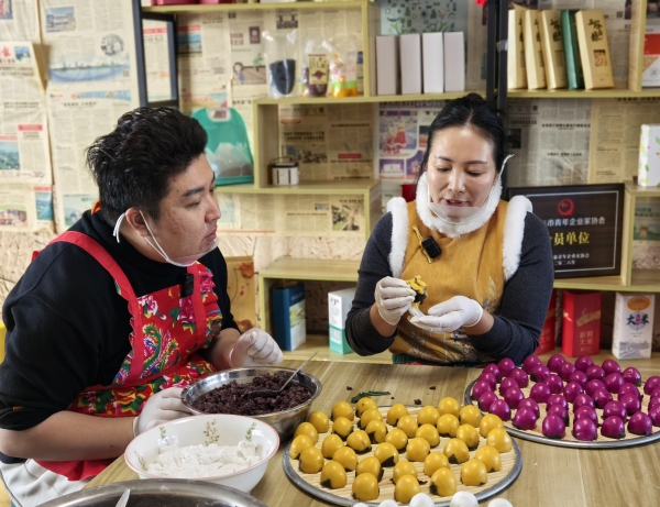 孟范丽介绍,作为“梅河口市·豆包第一村”孟氏关东水磨手工面点技艺第四代非遗代表性传承人,她在坚守传统工艺的基础上,持续推动产品创新。今年,团队在传统黏豆包的基础上推出多款“国潮糕点新花样”,包括火龙果、南瓜、松子、冰麦等多种创意口味,让传统年味更具年轻化、时尚化的表达。